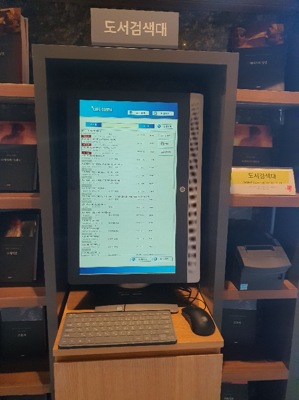 그 옆에는 북카페라 그런지 책을 검색할수 있는 검색대도 있습니다 .
